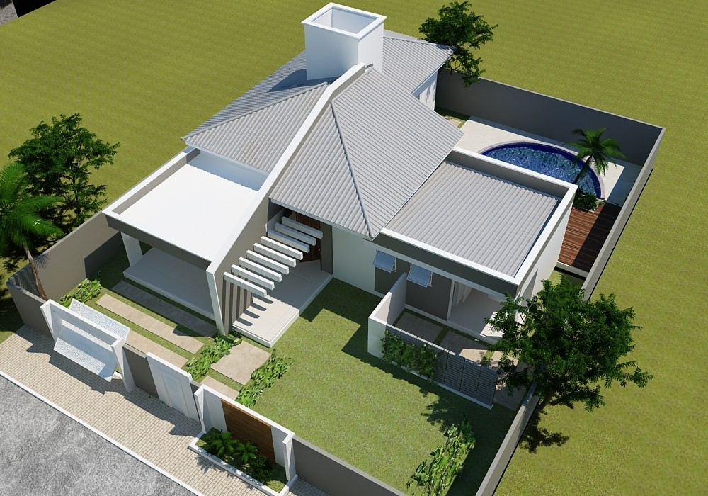 Mẫu biệt thự 1 tầng có hồ bơi này sở hữu hình khối vững chắc, tường bao kín. Điểm nhấn là phần cổng hiện đại với thiết kế mảng khối trang trí đẹp mắt. Thiết kế mái Thái hiện đại, phía trước không gian sân vườn thông thoáng với bãi cỏ xanh mát, lối vào sử dụng đá tự nhiên. Hồ bơi được thiết kế tại sân sau được ốp sàn nhựa kết hợp khối đá tự nhiên, cỏ tự nhiên tạo vẻ đẹp thẩm mỹ cao.
