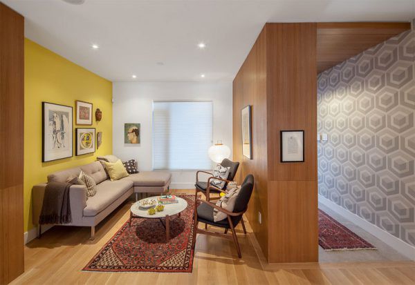 Không gian phòng khách này gây ấn tượng với khách hàng bởi thiết kế sàn gỗ kết hợp cùng vách ngăn bằng gỗ. Sự kết hợp hài hòa giữ hệ thống ghế sofa hình chứ I cùng chiếc bàn tròn, ghế đẩu tạo nên cảm giác hiện đại, mang lại sự tiện nghi cho gia đình. Bạn cũng có thể tô điểm thêm cho không gian phòng khách bằng cách sử dụng những bức tranh mini nhiều màu sắc. Mẫu phòng khách nhỏ đẹp và tinh tế này hoàn toàn thích hợp với những chủ nhân yêu thích sự mới mẻ, độc đáo và cá tính.