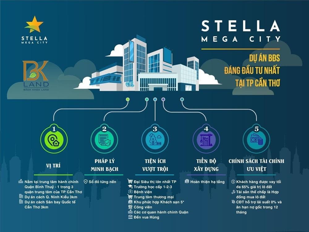 Dự án Stella Mega City có quy mô hơn 150ha, được xem là dự án bất động sản lớn nhất khu vực Đồng Bằng Sông Cửu Long. Sở hữu vị trí liền kề Sân bay quốc tế Cần Thơ – Cửa ngỏ di chuyền hàng không của khu vực ĐBSCL.