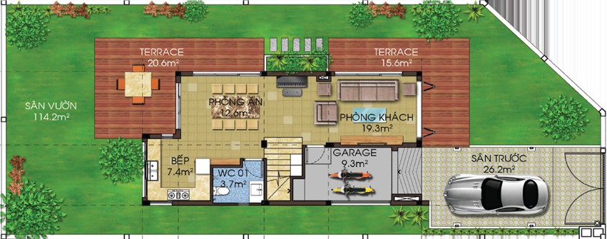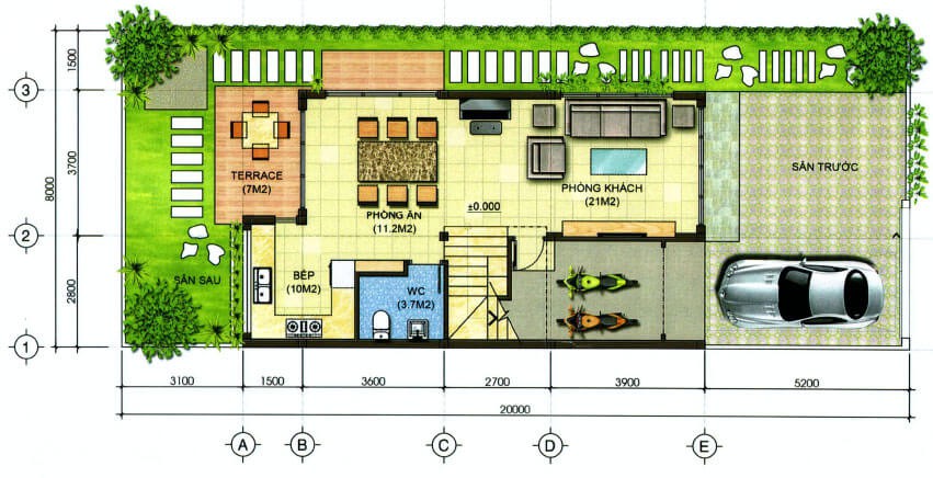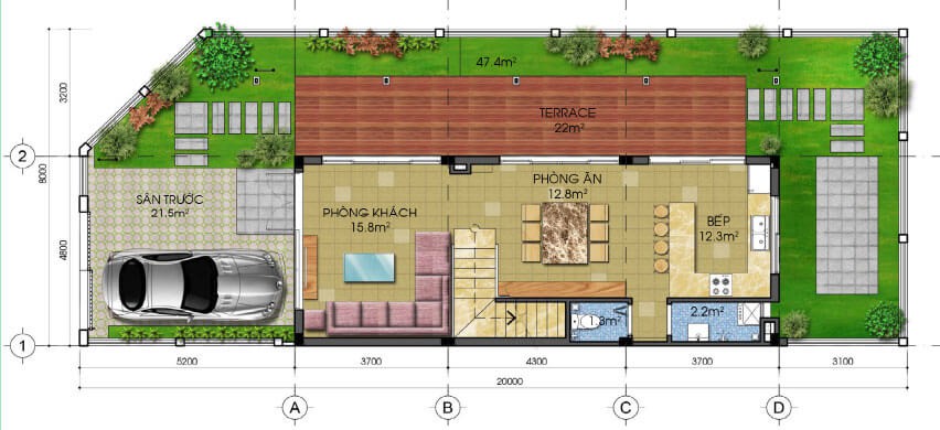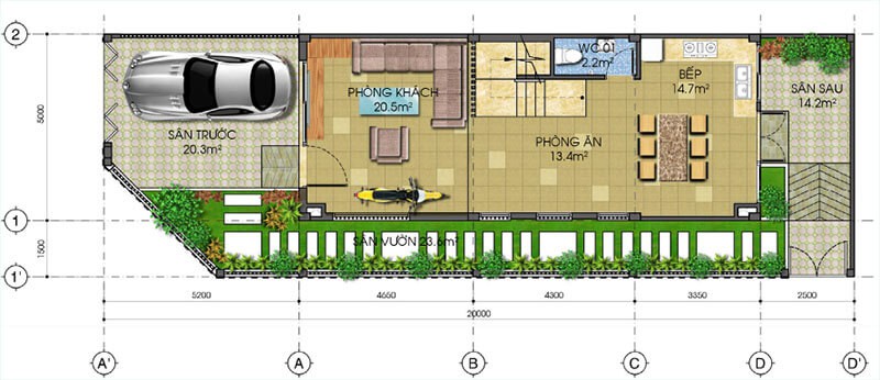 - Diện tích: 5×20 – DTXD: 264m2 (Trệt 61,5m2; L1 69,2m2; L2 67,4m2, Mái 66,1m2)